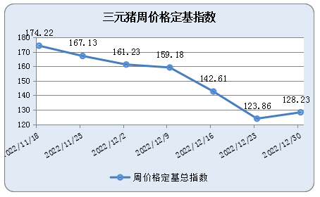 本周(12月24日-12月30日)金鑼集團三元豬周價格定基指數(shù)為128.23點,環(huán)比上調(diào)4.37點。