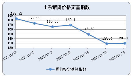 本周(12月24日-12月30日)金鑼集團土雜豬周價格定基指數(shù)為129.31點,環(huán)比上調(diào)0.77點。