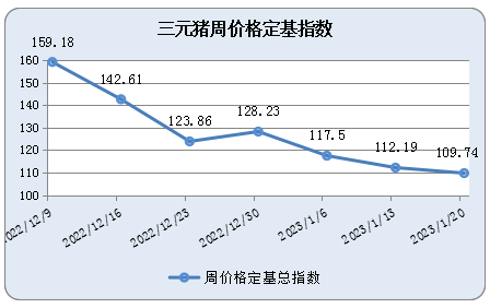 本周(1月14日-1月20日)金鑼集團三元豬周價格定基指數(shù)為109.74點,環(huán)比下調(diào)2.45點。