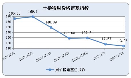 本周(1月7日-1月13日)金鑼集團(tuán)土雜豬周價(jià)格定基指數(shù)為113.96點(diǎn),環(huán)比下調(diào)3.61點(diǎn)。